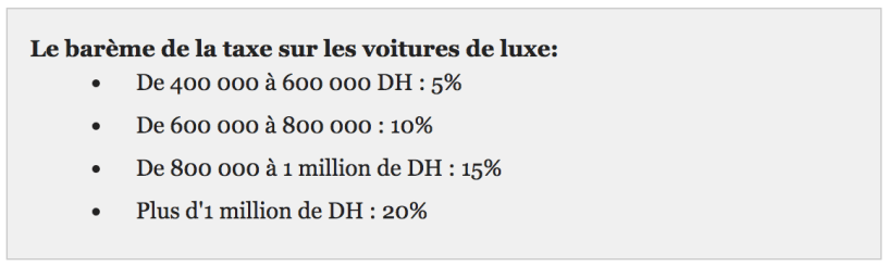 Pour en revenir au bareme de la taxe de luxe decidee par le gouvernement Benkirane en 2014, voici l’extrait d’un article du Huffpost Maghreb